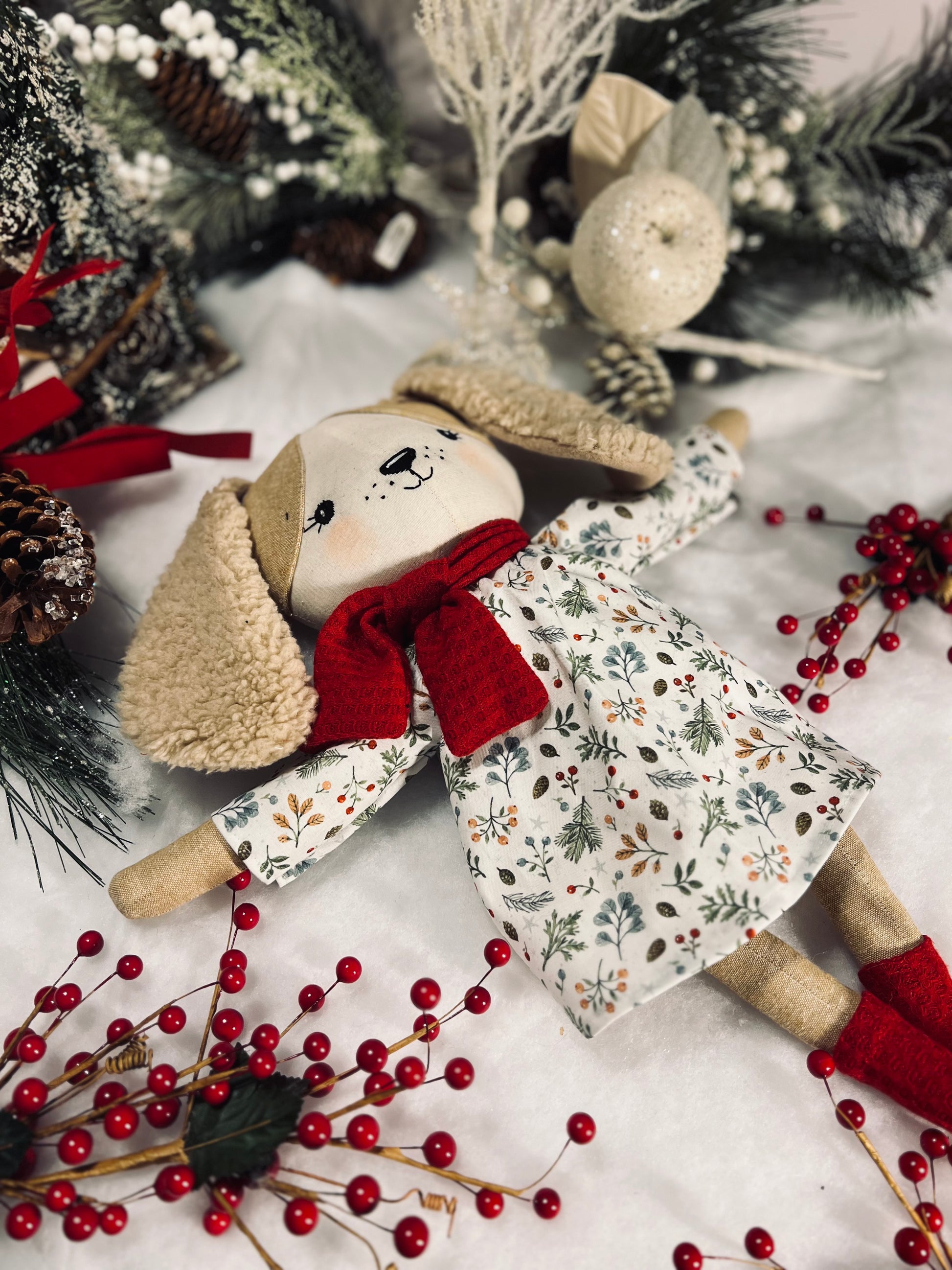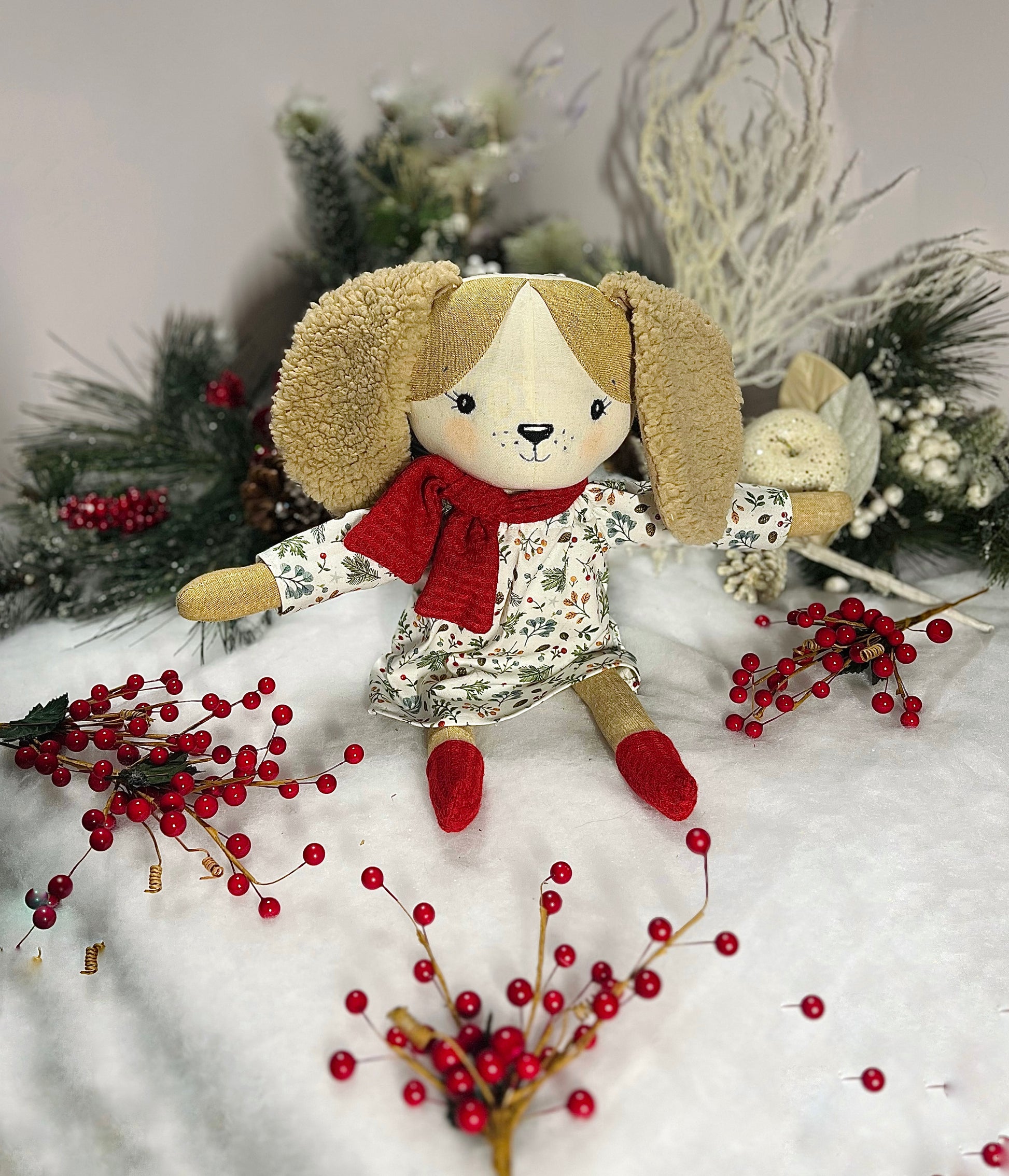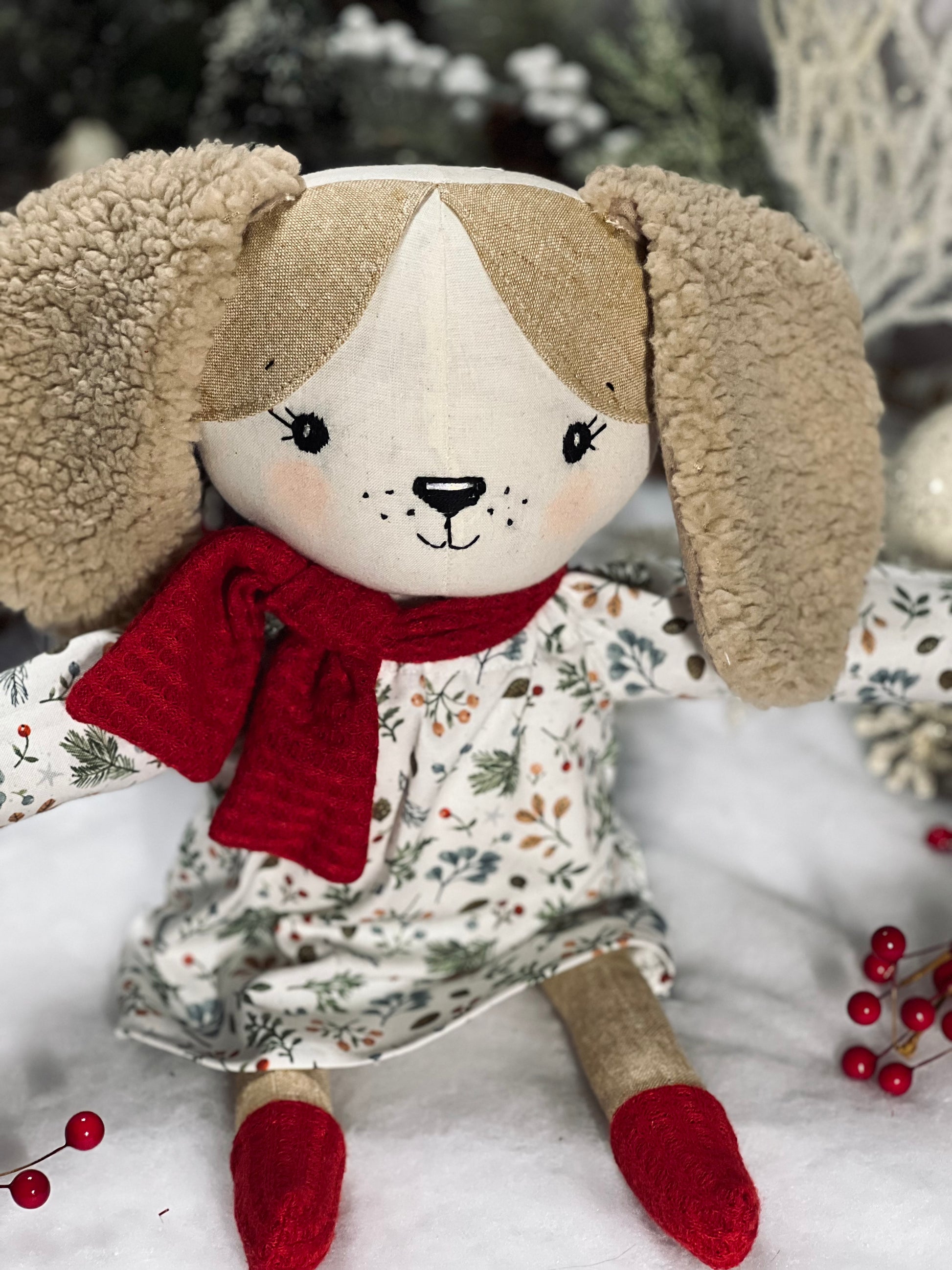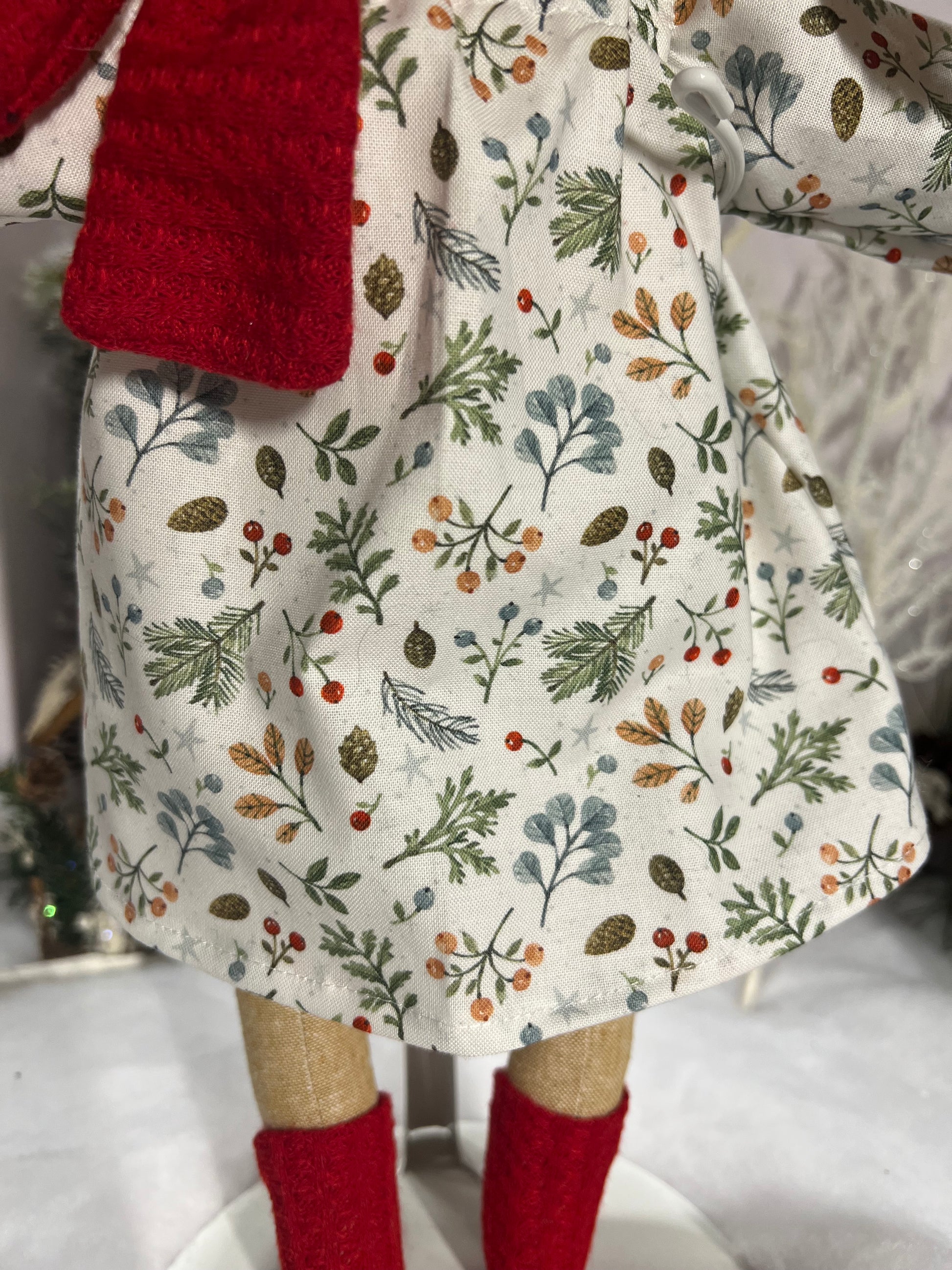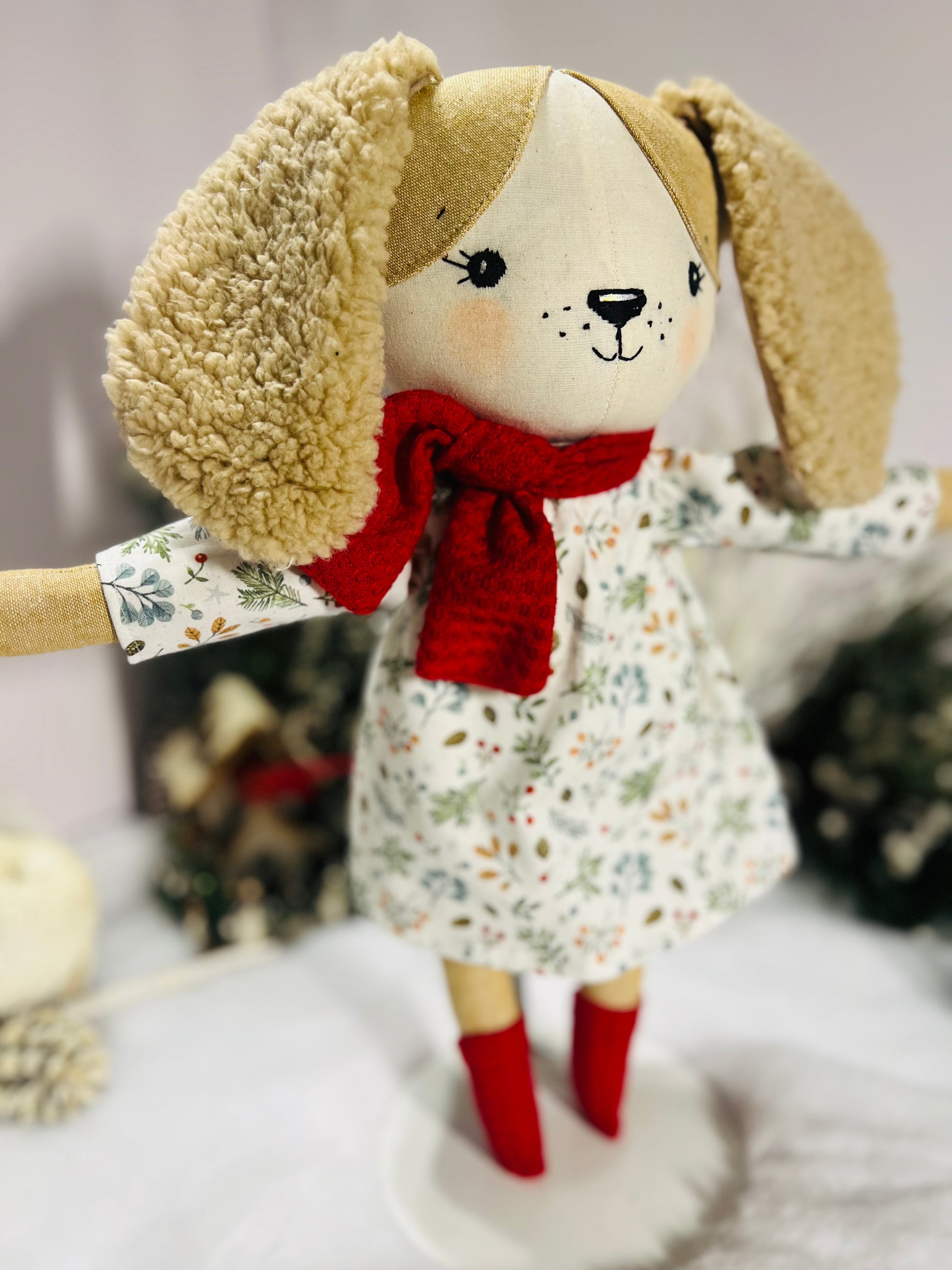 This doll is 15". Made with Robert Kaufman ESSEX Yarn Dyed Linen Cotton Blend, Cotton Flannel, Polyester Solid Sherpa, and 100% Cotton Canvas Fabric. The face is embroidered, and the cheeks are drawn on with colored pencils. The doll is stuffed with premium hypoallergenic polyester fiber fill without any added chemicals or flame retardants.